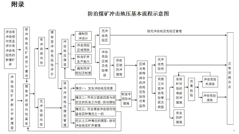 第一章 总 则 第一条 为了加强煤矿冲击地压防治工作,有效预防冲击地压事故,保障煤矿职工安全,根据《中华人民共和国安全生产法》《中华人民共和国矿山安全法》《国务院关于预防煤矿生产安全事故的特别规定》《煤矿安全规程》等法律、法规、规章和规范性文件的规定,制定《防治煤矿冲击地压细则》(以下简称《细则》)。 第二条 煤矿企业(煤矿)和相关单位的冲击地压防治工作,适用本细则。 第三条 煤矿企业(煤矿)的主要负责人(法定代表人、实际控制人)是冲击地压防治的第一责任人,对防治工作全面负责;其他负责人对分管范围内冲击地压防治工作负责;煤矿企业(煤矿)总工程师是冲击地压防治的技术负责人,对防治技术工作负责。 第四条 冲击地压防治费用必须列入煤矿企业(煤矿)年度安全费用计划,满足冲击地压防治工作需要。 第五条 冲击地压矿井必须编制冲击地压事故应急预案,且每年至少组织一次应急预案演练。 第六条 冲击地压矿井必须建立冲击地压防治安全技术管理制度、防治岗位安全责任制度、防治培训制度、事故报告制度等工作规范。 第七条 鼓励煤矿企业(煤矿)和科研单位开展冲击地压防治研究与科技攻关,研发、推广使用新技术、新工艺、新材料、新装备,提高冲击地压防治水平。 第二章 一般规定 第八条 冲击地压是指煤矿井巷或工作面周围煤(岩)体由于弹性变形能的瞬时释放而产生的突然、剧烈破坏的动力现象,常伴有煤(岩)体瞬间位移、抛出、巨响及气浪等。 冲击地压可按照煤(岩)体弹性能释放的主体、载荷类型等进行分类,对不同的冲击地压类型采取针对性的防治措施,实现分类防治。 第九条 在矿井井田范围内发生过冲击地压现象的煤层,或者经鉴定煤层(或者其顶底板岩层)具有冲击倾向性且评价具有冲击危险性的煤层为冲击地压煤层。有冲击地压煤层的矿井为冲击地压矿井。 第十条 有下列情况之一的,应当进行煤层(岩层)冲击倾向性鉴定: (一)有强烈震动、瞬间底(帮)鼓、煤岩弹射等动力现象的。 (二)埋深超过400米的煤层,且煤层上方100米范围内存在单层厚度超过10米、单轴抗压强度大于60MPa的坚硬岩层。 (三)相邻矿井开采的同一煤层发生过冲击地压或经鉴定为冲击地压煤层的。 (四)冲击地压矿井开采新水平、新煤层。 第十一条 煤层冲击倾向性鉴定按照《冲击地压测定、监测与防治方法 第2部分:煤的冲击倾向性分类及指数的测定方法》(GB/T 25217.2)进行。 第十二条 顶板、底板岩层冲击倾向性鉴定按照《冲击地压测定、监测与防治方法 第1部分:顶板岩层冲击倾向性分类及指数的测定方法》(GB/T 25217.1)进行。 第十三条 煤矿企业(煤矿)应当委托能够执行国家标准(GB/T 25217.1、GB/T 25217.2)的机构开展煤层(岩层)冲击倾向性的鉴定工作。鉴定单位应当在接受委托之日起90天内提交鉴定报告,并对鉴定结果负责。煤矿企业应当将鉴定结果报省级煤炭行业管理部门、煤矿安全监管部门和煤矿安全监察机构。 第十四条 开采具有冲击倾向性的煤层,必须进行冲击危险性评价。煤矿企业应当将评价结果报省级煤炭行业管理部门、煤矿安全监管部门和煤矿安全监察机构。 开采冲击地压煤层必须进行采区、采掘工作面冲击危险性评价。 第十五条 冲击危险性评价可采用综合指数法或其他经实践证实有效的方法。评价结果分为四级:无冲击地压危险、弱冲击地压危险、中等冲击地压危险、强冲击地压危险。 煤层(或者其顶底板岩层)具有强冲击倾向性且评价具有强冲击地压危险的,为严重冲击地压煤层。开采严重冲击地压煤层的矿井为严重冲击地压矿井。 经冲击危险性评价后划分出冲击地压危险区域,不同的冲击地压危险区域可按冲击危险等级采取一种或多种的综合防治措施,实现分区管理。 第十六条 新建矿井在可行性研究阶段应当根据地质条件、开采方式和周边矿井等情况,参照冲击倾向性鉴定规定对可采煤层及其顶底板岩层冲击倾向性进行评估,当评估有冲击倾向性时,应当进行冲击危险性评价,评价结果作为矿井立项、初步设计和指导建井施工的依据,并在建井期间完成煤层(岩层)冲击倾向性鉴定。 第十七条 煤层(矿井)、采区冲击危险性评价及冲击地压危险区划分可委托具有冲击地压研究基础与评价能力的机构或由具有5年以上冲击地压防治经验的煤矿企业开展,编制评价报告,并对评价结果负责。 采掘工作面冲击危险性评价可由煤矿组织开展,评价报告报煤矿企业技术负责人审批。 第十八条 有冲击地压矿井的煤矿企业必须明确分管冲击地压防治工作的负责人及业务主管部门,配备相关的业务管理人员。冲击地压矿井必须明确分管冲击地压防治工作的负责人,设立专门的防冲机构,并配备专业防冲技术人员与施工队伍,防冲队伍人数必须满足矿井防冲工作的需要,建立防冲监测系统,配备防冲装备,完善安全设施和管理制度,加强现场管理。 第十九条 冲击地压防治应当坚持“区域先行、局部跟进、分区管理、分类防治”的原则。 第二十条 冲击地压矿井必须编制中长期防冲规划和年度防冲计划。中长期防冲规划每3至5年编制一次,执行期内有较大变化时,应当在年度计划中补充说明。中长期防冲规划与年度防冲计划由煤矿组织编制,经煤矿企业审批后实施。 中长期防冲规划主要包括防冲管理机构及队伍